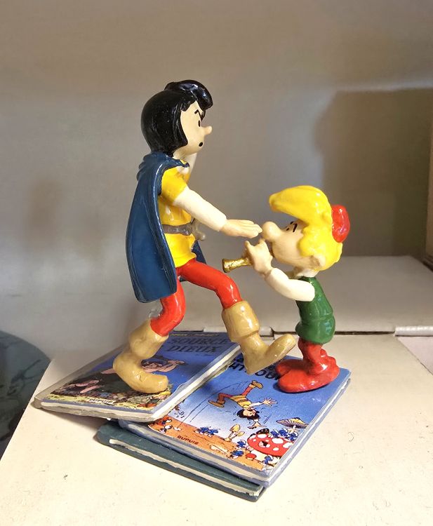Figurine de Pirlouit jouant de la flute et Johan déséquilibré sur la pile d'albums.
