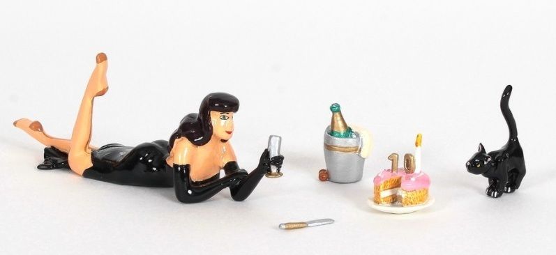 Composé de la Pin Up, d'un chat noir, un gâteau, un couteau et un seau à champagne