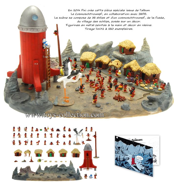 La Scène est composée, d'un décor, de la fusée, d'un cosmoschtroumpf, de 35 Schlips, du village des Schlips